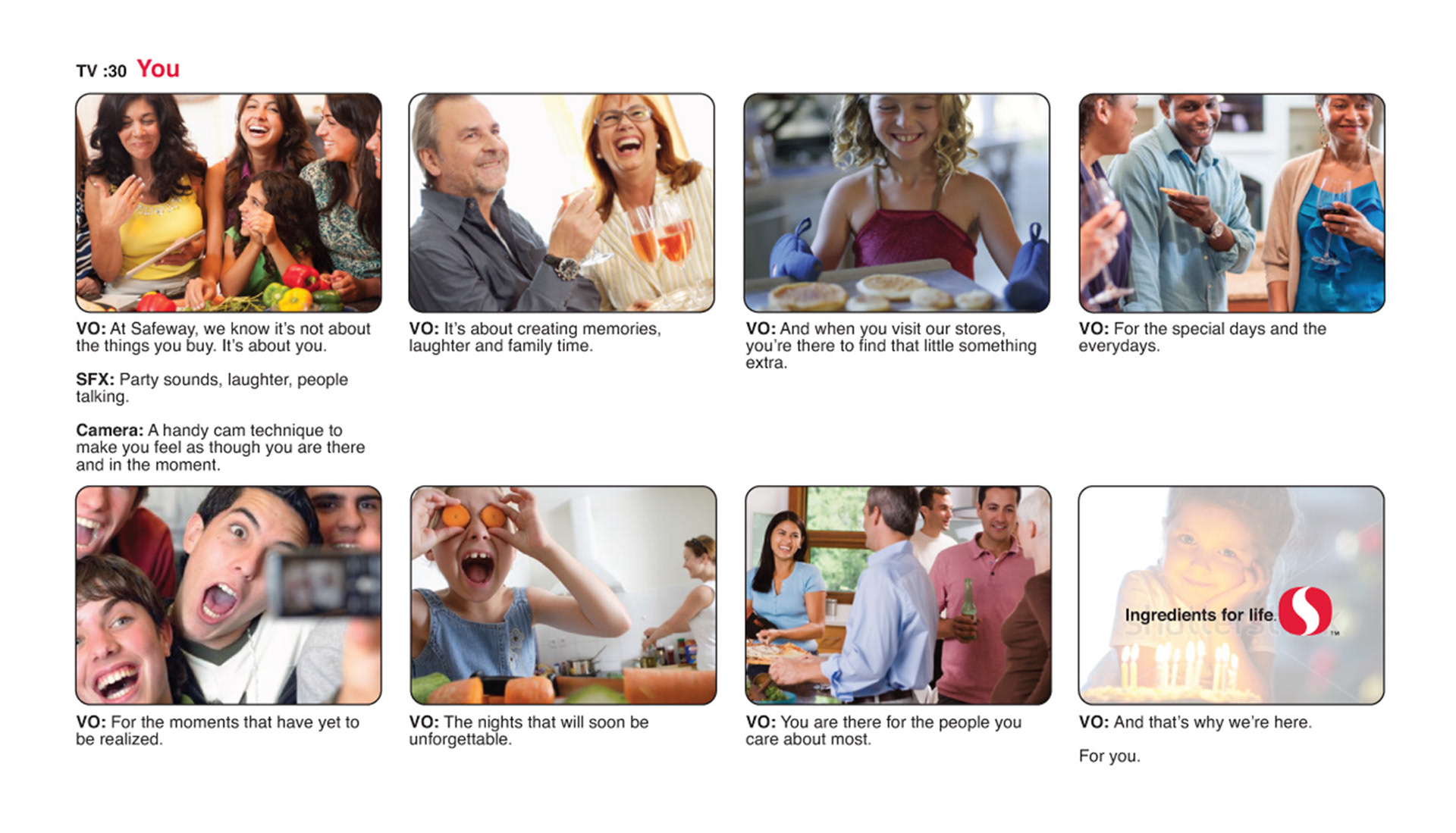 Safeway rebranding project, exploring the brand tagline "Ingredients for life." The creative teams were tasked with bringing the tagline to the forefront and defining what it truly means to the consumer.
